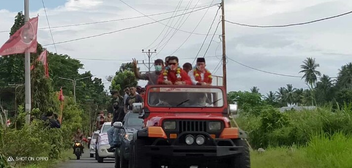 HALBAR. Opsi – Antusias ribuan warga tak terbendung dalam rangkaian acara penjemputan menyambut kedatangan Pasangan Calon (Paslon) Bupati dan Wakil Bupati Kabupaten Halmahera Barat, periode 2020 -2025, Danny Missy – Imran Lolory, Jumat (14/8), siang sekira pukul 15.30 wit – selesai.