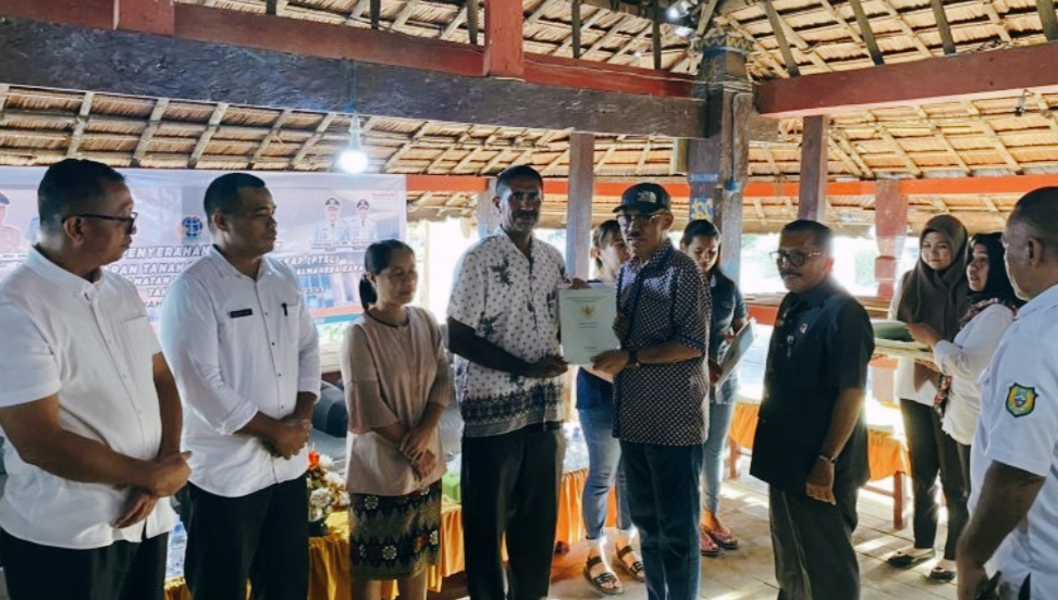JAILOLO, Opsinews.com – Bupati Halmahera Barat, Maluku Utara, James Uang, bersama Kepala Badan Pertanahan Nasional (BPN) Halbar Arman Anwar menyerahkan sertifikat program Pendaftaran Tanah Sistematis Lengkap (PTSL), kepada 561 warga di Desa Gamomeng, Kecamatan Sahu Timur, Rabu 08 November 2023.