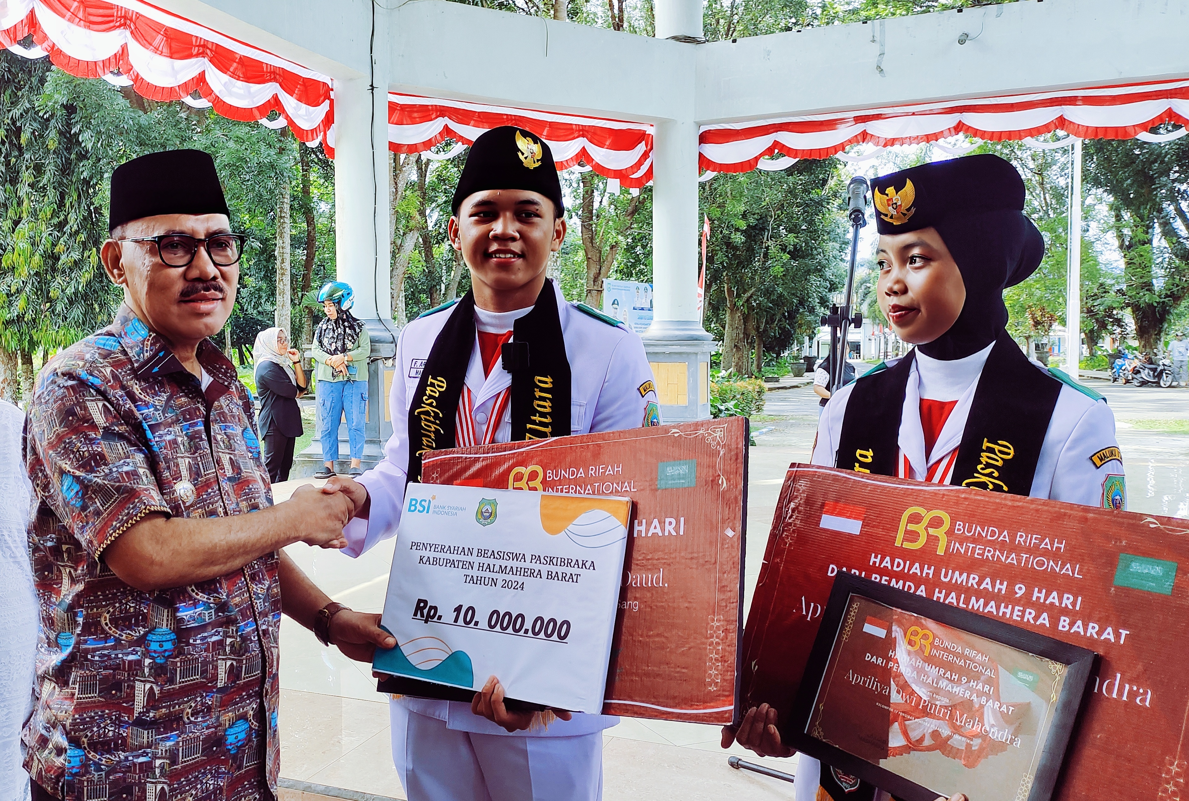 Sementara itu, selain menyerahkan bantuan uang tunai, Pemda Halbar juga bekerja sama dengan travel Bunda Ruda internasional untuk memberikan hadiah umroh kepada kedua Paskibraka dan orang tuanya.**