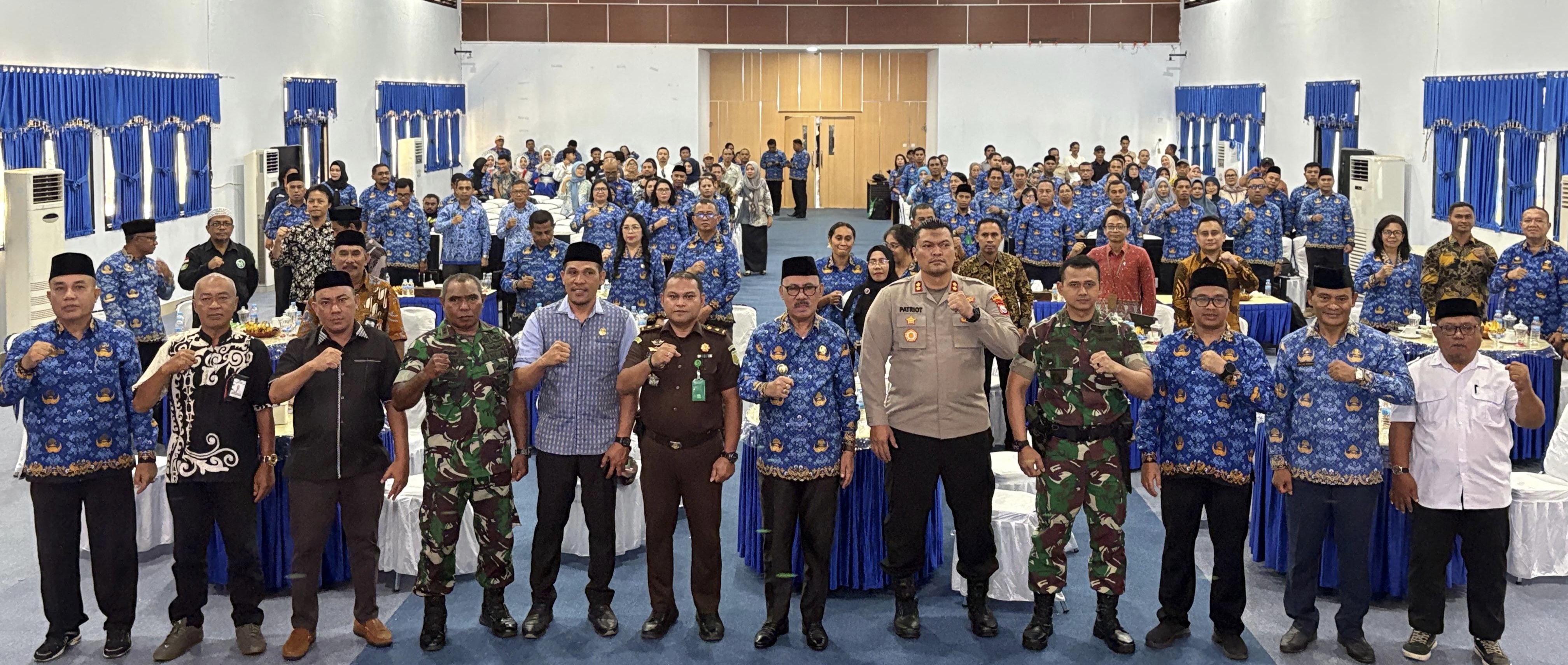 Kegiatan yang berlangsung di Aula Bidadari kantor Bupati Halbar, Kamis (09/4/2026) dan dihadiri Bupati Halbar James Uang, Sekretaris Daerah (Sekda) Julius Marau, Ketua DPRD Halbar Ibnu Saud Kadim, Waka I DPRD Halbar Rustam Fabanyo, Kepala Bappeda Halbar Faris Hi. Abdulbar, tokoh masyarakat, akademisi, serta perwakilan OKP.